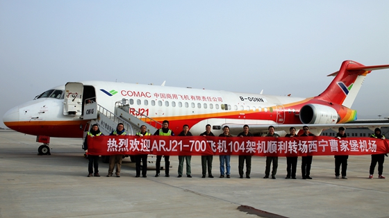 2017年(nian)2月21日,ARJ21-700飛機104架機從西安(an)閻良機場(chang)起飛,經過1小時18分鐘空中飛行,順利降(jiang)落西寧曹(cao)家(jia)堡機場(chang)。