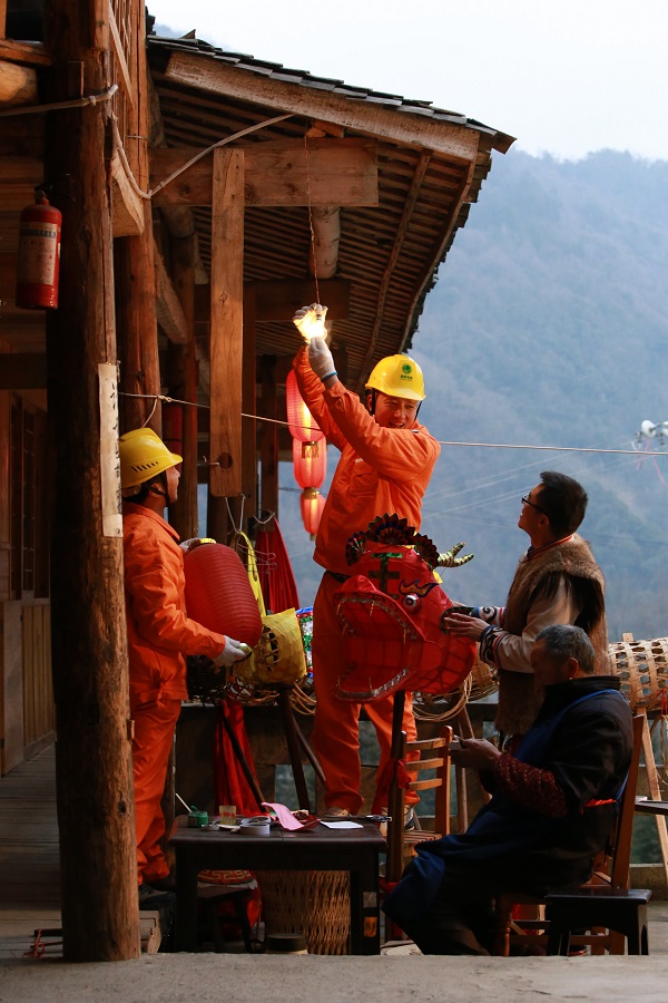 2017年羌歷新年,北川供電公司接到報修電話,黨員服務隊緊急出動搶修,燈亮了,羌寨一派喜氣洋洋的新年氛圍。田海 攝