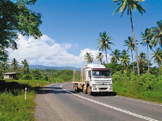 瓦努阿島是南太平洋島國斐濟第二大島。中鐵一局斐濟公司在島上修建的納布瓦魯高速公路和布扎貝高速公路解決了人們出行的“老大難”問題,有力拉動了經濟發展,被斐濟民眾譽為“斐中兩國友好的紐帶”“共同發展致富的高速路”。圖為一輛卡車行駛在布扎貝高速公路上。(新華社記者 張永興攝)