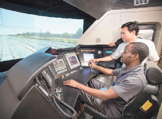 日前,來自泰國、斯里蘭卡、老撾等13個國家的63名鐵路管理人員來到武漢高鐵訓練段進行參訪交流活動。在“一帶一路”背景下,2015年開始武漢高鐵訓練段已舉辦了泰國、老撾等14批涉外鐵路技能培訓班,培訓涉外學員400余人次。圖為來自肯尼亞的賈斯特斯·卡洛·姆文加在高鐵模擬駕駛倉內體驗實際操作。(新華社記者 肖藝九攝)