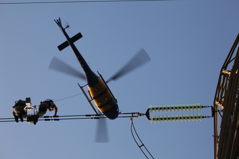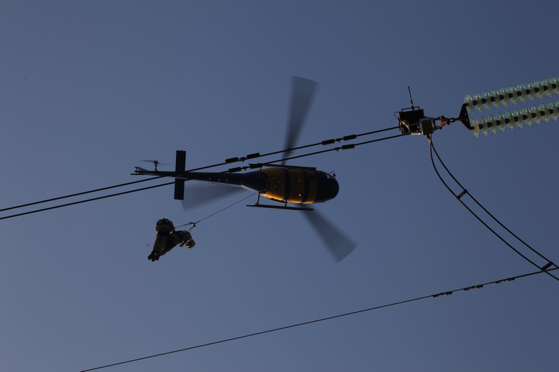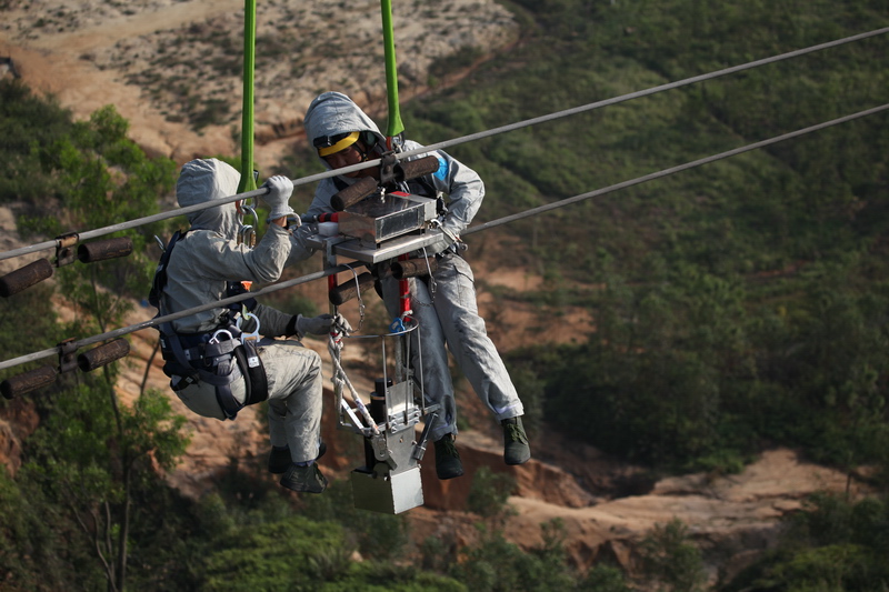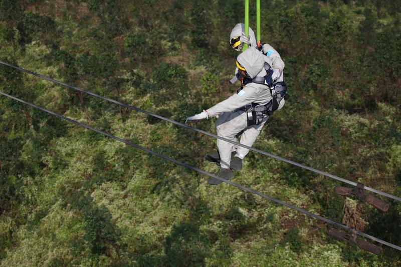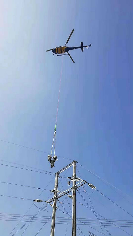 帶電作業人員借助直升機進入線路等電位,開展X光檢測。楊惠平 攝