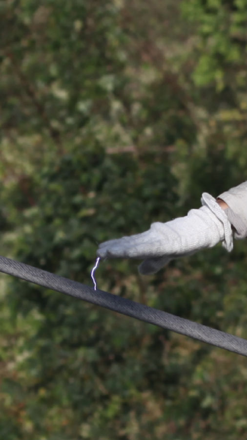 作業人員手觸220千伏帶電導線瞬間,有電弧產生。楊惠平 攝
