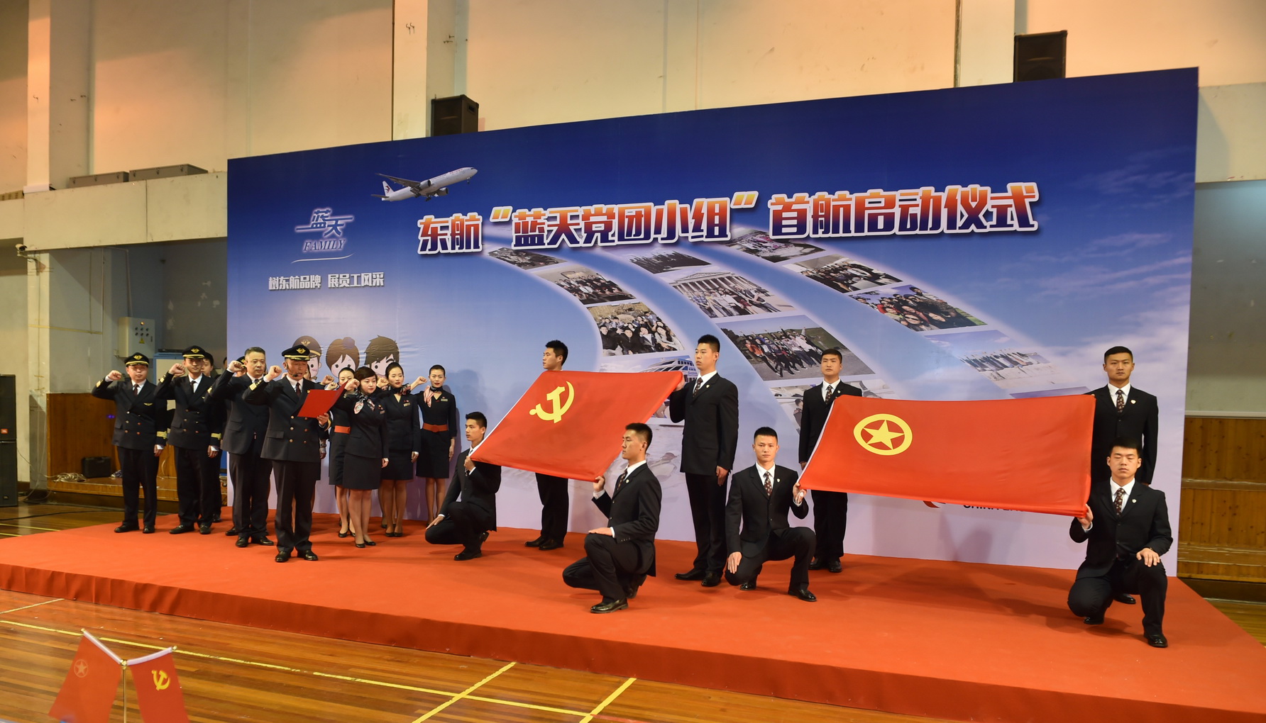 2016年4月6日,在上海-舊金山MU589航班上,東航首個“藍天黨小組”正式亮相,航班起飛前的成立儀式上,來自飛行、客艙、空保三個不同空勤部門的該次航班機組黨團員,接過授旗,組成臨時小組,開展黨建團建、加強日常工作、應對突發狀況。