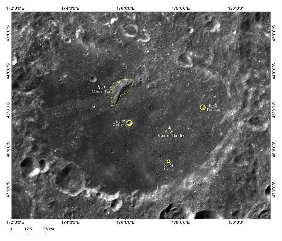 2019年(nian)2月(yue)(yue)(yue)15日,中國(guo)(guo)國(guo)(guo)家航天局、中國(guo)(guo)科學(xue)(xue)院和(he)國(guo)(guo)際天文學(xue)(xue)聯(lian)合(he)會聯(lian)合(he)召開新聞發(fa)布會,向全世界(jie)發(fa)布嫦(chang)娥(e)(e)(e)四(si)號(hao)著(zhu)(zhu)陸(lu)區域月(yue)(yue)(yue)球(qiu)(qiu)地(di)理實(shi)體命(ming)(ming)名(ming)(ming)(ming)。2019年(nian)2月(yue)(yue)(yue)4日,國(guo)(guo)際天文學(xue)(xue)聯(lian)合(he)會(IAU)批準了利(li)用探月(yue)(yue)(yue)工程(cheng)嫦(chang)娥(e)(e)(e)二號(hao)和(he)嫦(chang)娥(e)(e)(e)四(si)號(hao)高分辨(bian)月(yue)(yue)(yue)面影像數據(ju)申報的(de)嫦(chang)娥(e)(e)(e)四(si)號(hao)著(zhu)(zhu)陸(lu)點(dian)及其附近5個月(yue)(yue)(yue)球(qiu)(qiu)地(di)理實(shi)體命(ming)(ming)名(ming)(ming)(ming):嫦(chang)娥(e)(e)(e)四(si)號(hao)著(zhu)(zhu)陸(lu)點(dian)命(ming)(ming)名(ming)(ming)(ming)為(wei)天河(he)(he)基地(di);著(zhu)(zhu)陸(lu)點(dian)周圍呈三角形排列的(de)三個環(huan)形坑,分別命(ming)(ming)名(ming)(ming)(ming)為(wei)織女(nv)、河(he)(he)鼓和(he)天津;著(zhu)(zhu)陸(lu)點(dian)所在馮·卡門坑內的(de)中央(yang)峰命(ming)(ming)名(ming)(ming)(ming)為(wei)泰山。這是我國(guo)(guo)月(yue)(yue)(yue)球(qiu)(qiu)探測工程(cheng)科學(xue)(xue)數據(ju)成果(guo)在月(yue)(yue)(yue)球(qiu)(qiu)地(di)理實(shi)體命(ming)(ming)名(ming)(ming)(ming)上的(de)又(you)一次(ci)重要應(ying)用。