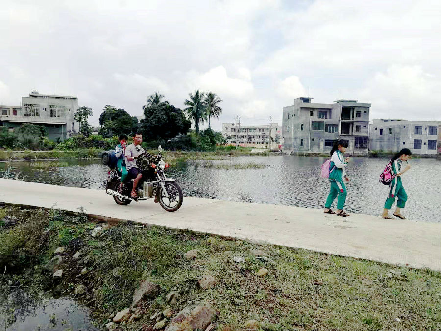 10月(yue)17日,早(zao)上(shang)七點的(de)(de)(de)陽光溫柔穿(chuan)過椰(ye)林(lin),灑在海南省定安(an)縣龍(long)河(he)鎮安(an)良村(cun)去上(shang)學的(de)(de)(de)孩(hai)子(zi)(zi)們(men)身上(shang)。只見(jian),孩(hai)子(zi)(zi)們(men)三五(wu)成(cheng)群,背著書(shu)包,滿(man)心歡喜地走在去學校的(de)(de)(de)路(lu)(lu)上(shang)。他們(men)的(de)(de)(de)腳下,一(yi)條寬2米,離(li)地面(mian)80厘米高(gao)的(de)(de)(de)水泥路(lu)(lu)一(yi)直向前延伸(shen)。路(lu)(lu)的(de)(de)(de)兩邊是兩個小池塘,水面(mian)倒映著藍天白云和(he)周圍居民樓,煞(sha)是好看(kan)。