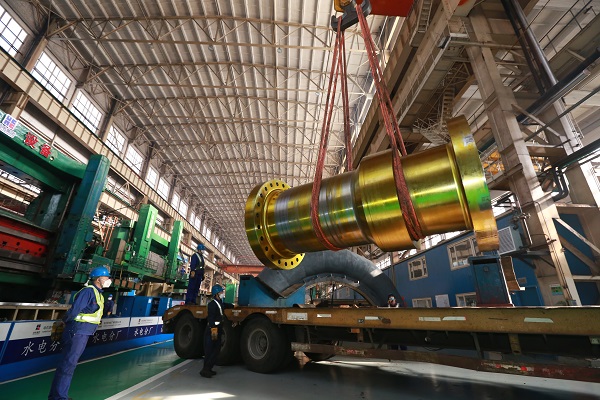 哈電集團(tuan)有序(xu)復(fu)(fu)工復(fu)(fu)產(chan),操作者正在吊運兩河(he)口4號機(ji)主軸。