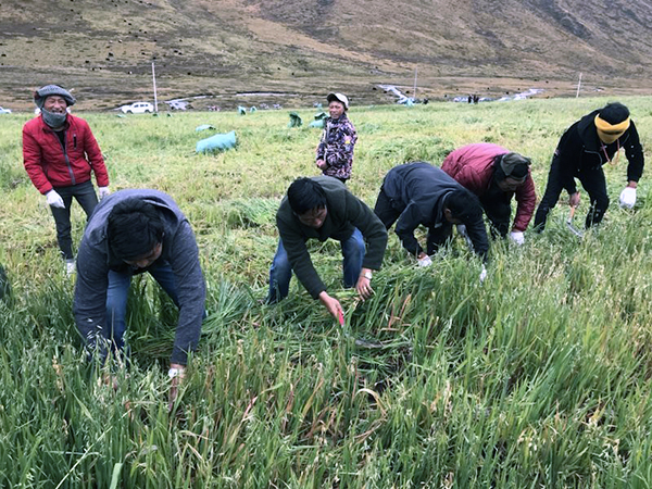 中國鐵建在青海甘德投資100萬元建設1000畝草場,有效增加了農民收入。圖為牧民在收割牧草。