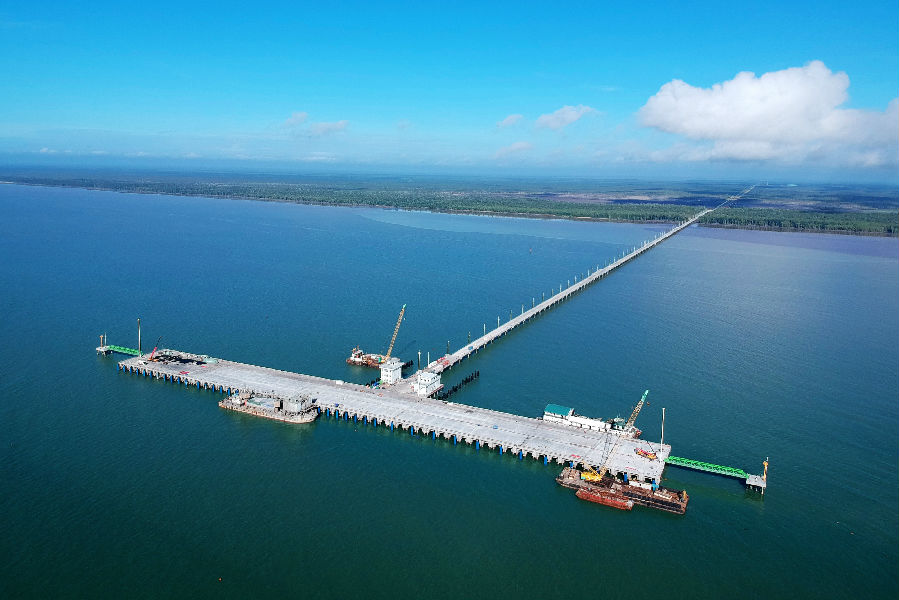 該(gai)項(xiang)目位于印尼蘇門答臘島南(nan)部,邦加海峽西側,主要新建1個長(chang)450米、寬50米的碼(ma)(ma)頭平臺,1座(zuo)長(chang)3029米的接(jie)岸引橋及(ji)相關(guan)配(pei)(pei)套設(she)施(shi)。施(shi)工(gong)(gong)過程中,該(gai)項(xiang)目人員克服大(da)型(xing)施(shi)工(gong)(gong)船舶(bo)無法在紅樹林(lin)保護區域(yu)內展(zhan)開鋼(gang)管樁沉(chen)樁和橫(heng)(heng)梁施(shi)工(gong)(gong)等難(nan)題,集思廣(guang)益,最終確定先(xian)用100尺駁船配(pei)(pei)合2臺挖機(ji)進行河道整平工(gong)(gong)作,再用150尺駁船配(pei)(pei)合150噸(dun)履帶吊從首排架向海側進行樁基(ji)橫(heng)(heng)梁施(shi)工(gong)(gong),確保碼(ma)(ma)頭主體(ti)工(gong)(gong)程順利完工(gong)(gong)。