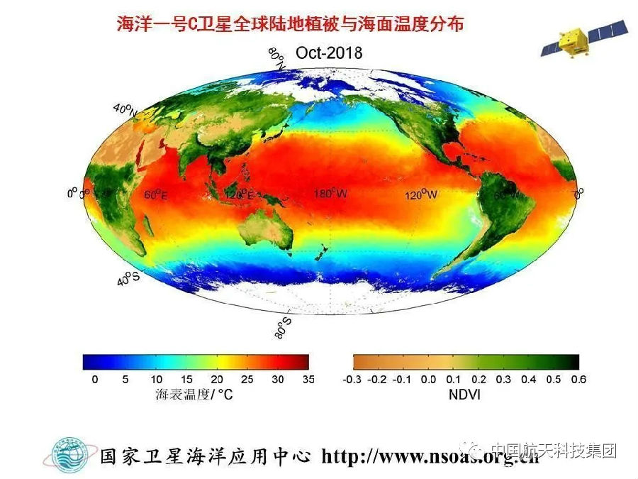 海洋一號C衛星海面溫度、全球植被、全球陸地植被與海洋葉綠素濃度、全球陸地植被與海面溫度分布圖