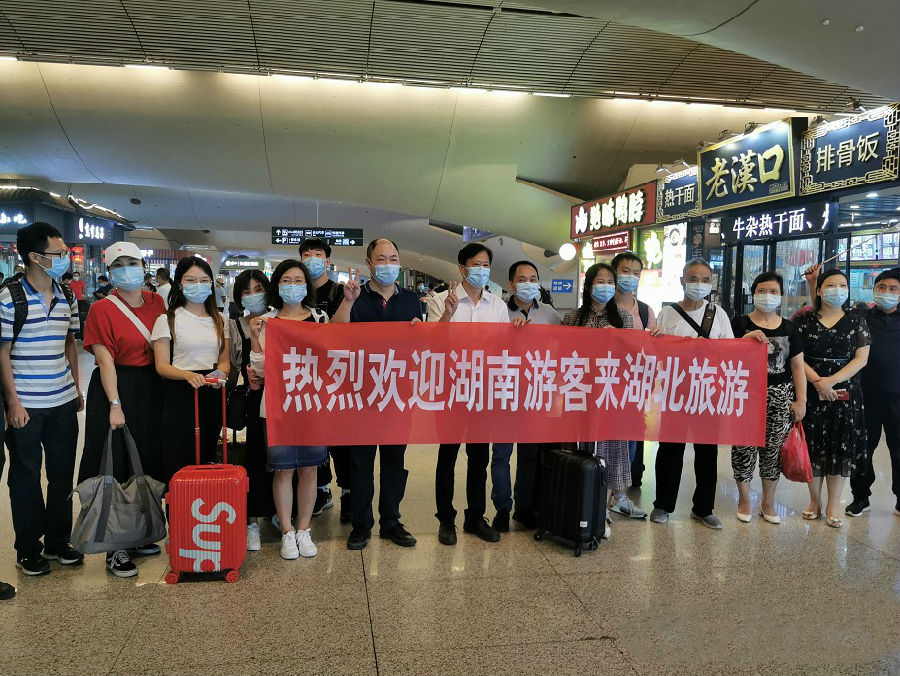 7月20日下(xia)午,G552次列(lie)車停靠武(wu)漢(han)站(zhan),來自湖南省(sheng)一行(xing)8人(ren)的旅(lv)行(xing)團到達江城武(wu)漢(han)。湖北(bei)省(sheng)文(wen)旅(lv)廳相關(guan)負責人(ren)、中(zhong)國旅(lv)游集團武(wu)漢(han)國旅(lv)負責人(ren)及相關(guan)工(gong)作人(ren)員在出站(zhan)口(kou)迎接(jie)湖北(bei)省(sheng)首個跨省(sheng)游團隊,也是(shi)武(wu)漢(han)市的首個外省(sheng)團隊。