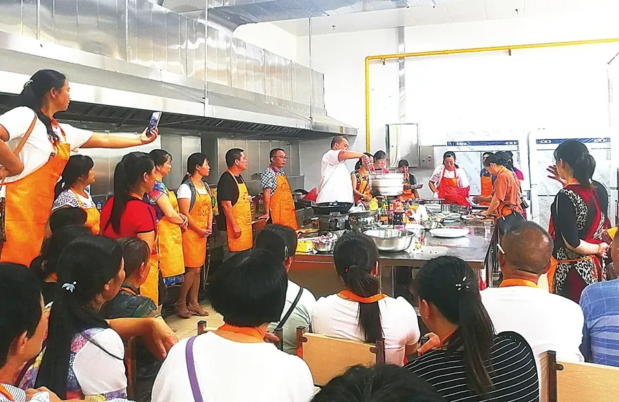 通過實施“人人有技能”培訓工程, 中國中鐵精準幫扶當地貧困學子進行電工、 焊工、 挖掘機、鏟車和廚師等專業培訓, 解決就業難題(圖為校園廚師培訓現場)。
