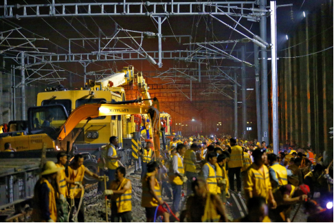 8月26日凌晨,施工人員正在進行福平鐵路引入福州南站軌道撥接作業。