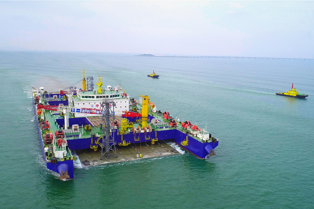 相較于E1、E2管節,E3管節的(de)安(an)裝(zhuang)首次進(jin)入海平面20米以下深水區。安(an)裝(zhuang)過程中,由世界最大最先進(jin)自升(sheng)式(shi)的(de)碎石(shi)鋪設整(zheng)平船(chuan)“一航津(jin)平2”首次在(zai)國內采(cai)用半(ban)漂浮方式(shi)作業,順利完成基床整(zheng)平,在(zai)有效保障(zhang)工期(qi)的(de)同時(shi),填補(bu)了該(gai)領域的(de)技術空白(bai)。