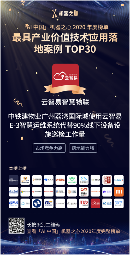 據了解,作為目(mu)前(qian)國(guo)內人工(gong)智(zhi)(zhi)能界規(gui)模最大、評選(xuan)最權威的(de)(de)年(nian)度(du)獎項(xiang),機器之(zhi)心年(nian)度(du)獎項(xiang)已(yi)成(cheng)為我國(guo)人工(gong)智(zhi)(zhi)能產業(ye)的(de)(de)風向標(biao)。“最具產業(ye)價值技術應用落地案例TOP30”榜單主要關(guan)注近兩年(nian)落地實踐的(de)(de)數字化轉型(xing)、產業(ye)智(zhi)(zhi)能化升級案例及相(xiang)關(guan)成(cheng)果,其獲獎案例均為所處行業(ye)的(de)(de)標(biao)桿項(xiang)目(mu)。此次中鐵建(jian)(jian)物業(ye)廣州荔灣國(guo)際城智(zhi)(zhi)慧社區項(xiang)目(mu)榮登榜單,為行業(ye)智(zhi)(zhi)慧社區建(jian)(jian)設提供了一份可借鑒的(de)(de)案例樣本。