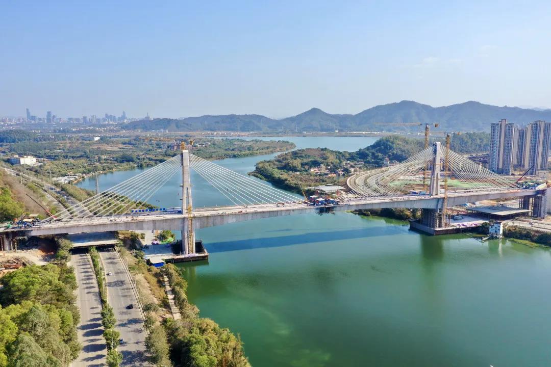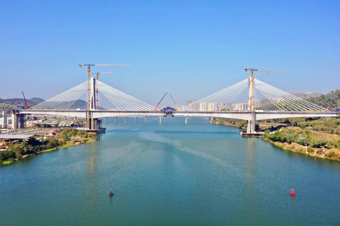 贛深(shen)高鐵是(shi)我國“八(ba)縱八(ba)橫”高速(su)(su)鐵路網京(jing)九高鐵的(de)重(zhong)要組成(cheng)部分(fen),連接江(jiang)西(xi)贛州至廣東深(shen)圳,正(zheng)線全長432公里(li)(li),設計最(zui)高時速(su)(su)為(wei)350公里(li)(li)。此次合龍的(de)劍潭東江(jiang)特大橋(qiao)跨點位于(yu)惠州市東江(jiang)水利樞紐(niu)上游約1.4公里(li)(li)處,全長925米(mi),主橋(qiao)為(wei)四線一(yi)聯矮塔斜拉(la)橋(qiao),均鋪設無砟軌道,主跨260米(mi),橋(qiao)寬31米(mi)。其主梁為(wei)單箱三(san)室變(bian)截面箱梁,共計32個掛籃懸澆節段,其中15號節段單側重(zhong)達820噸,刷新了全國單節段橋(qiao)體最(zui)重(zhong)紀錄。