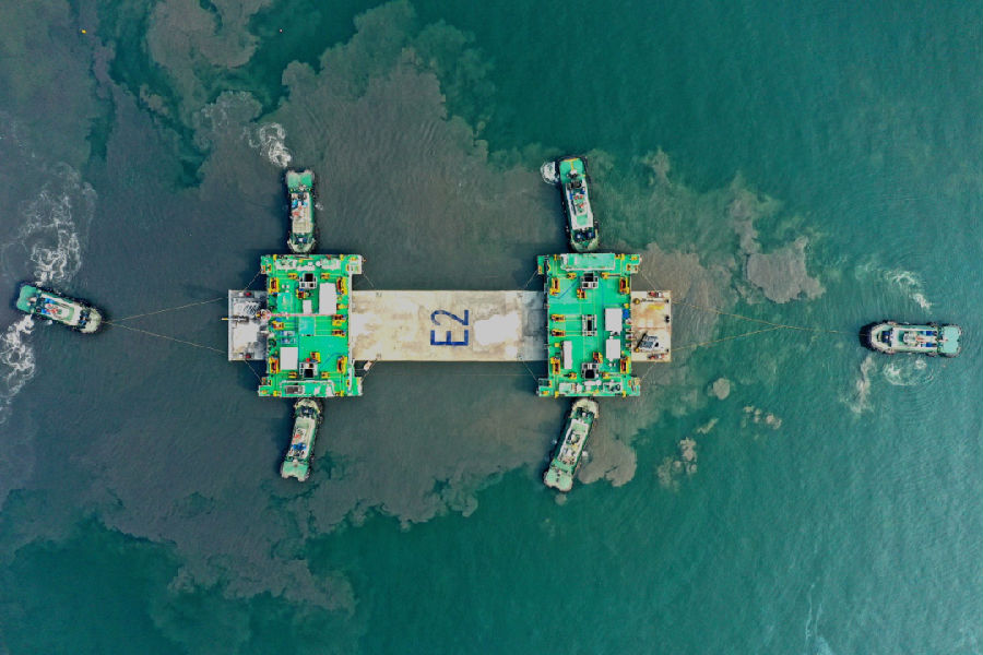 此次安裝(zhuang)的(de)E2管節(jie)為標準(zhun)管節(jie),長180米(mi)、寬(kuan)33.4米(mi)、高9.7米(mi)、重約6萬噸,與2020年12月9日已安裝(zhuang)的(de)E1非標準(zhun)管節(jie)相(xiang)比,E2管節(jie)長度更長,重量更大,水箱(xiang)配載更多,浮(fu)運安裝(zhuang)難(nan)度也更高。