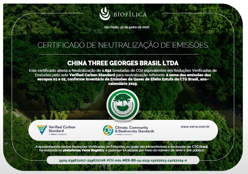 三峽巴西公司始終(zhong)將可持續發展融入(ru)企業(ye)發展基因,在提供清潔(jie)能源的同(tong)時貫徹綠色(se)環保理念(nian),助力低碳減排(pai)。2019年,三峽巴西公司獲得巴西溫(wen)室氣體核算體系項目(又稱“溫(wen)室氣體議(yi)定(ding)書”)金章認證。