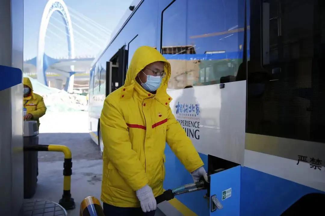 加油員為冬奧車輛加注氫氣