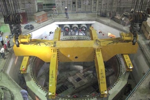 中國水電承建的緬甸耶瓦水電站3號機定子吊裝就位