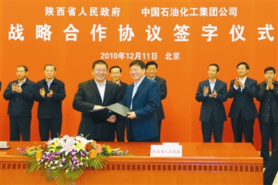 12月11日,中國石油化工集團公司與陜西省人民政府舉行戰略合作協議簽字儀。雙方表示將充分發揮各自優勢,進一步擴大合作領域和規模。