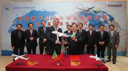 2011年6月21日,中國商飛公司與愛爾蘭瑞安航空公司在巴黎航展上簽署合作諒解備忘錄。這標志著中國商飛公司與國際知名航空運營公司的交流合作又取得了新進展。