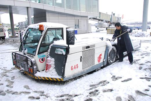 國航工作人員在為站坪特種車輛清除積雪