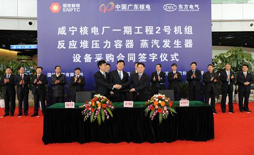 2009年12月2日,國家核電技術公司所屬成員企業國核工程有限公司作為采購方,與中國東方電氣集團公司所屬東方電氣股份有限公司與東方電氣(廣州)重型機械有限公司組成的設備制造聯合體,以及設備最終用戶咸寧核電有限公司共同簽訂了我國首批內陸核電站——湖北咸寧核電站一期工程2號機組反應堆壓力容器、蒸汽發生器訂貨合同。這是我國積極推進第三代核電AP1000國產化后續機組建設實現的又一個重要里程碑目標。