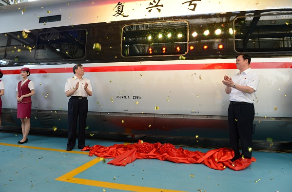 6月(yue)25日,由中(zhong)(zhong)國(guo)(guo)鐵(tie)(tie)路總(zong)公(gong)司(si)牽頭(tou)組織,中(zhong)(zhong)國(guo)(guo)中(zhong)(zhong)車四方股(gu)份(fen)公(gong)司(si)、長(chang)客(ke)股(gu)份(fen)公(gong)司(si)研制,具有完全自主知識產權、達到世界先(xian)進水平的中(zhong)(zhong)國(guo)(guo)標準動車組被命(ming)名為(wei)“復興(xing)號(hao)”。鐵(tie)(tie)路總(zong)公(gong)司(si)黨組書(shu)記、總(zong)經理陸東福,中(zhong)(zhong)國(guo)(guo)中(zhong)(zhong)車黨委(wei)書(shu)記、董事長(chang)劉(liu)化龍為(wei)“復興(xing)號(hao)”動車組揭牌。6月(yue)26日,“復興(xing)號(hao)”動車組率(lv)先(xian)在京(jing)滬高鐵(tie)(tie)兩端的北(bei)京(jing)南(nan)站(zhan)(zhan)和上海虹(hong)橋站(zhan)(zhan)雙向首發。