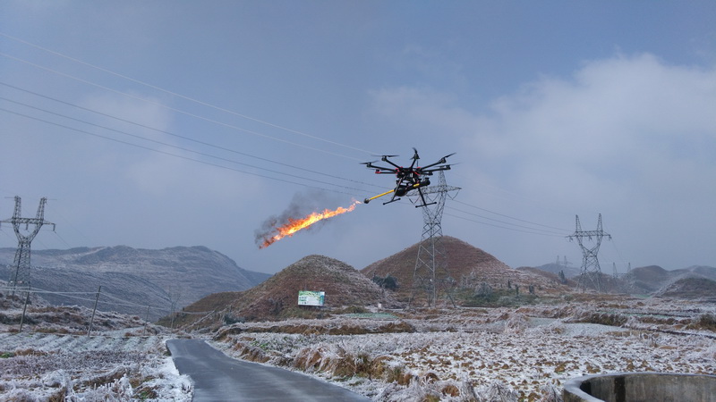 南方電網在國內率先嘗試噴火無人機對高壓線路地線進行除冰作業