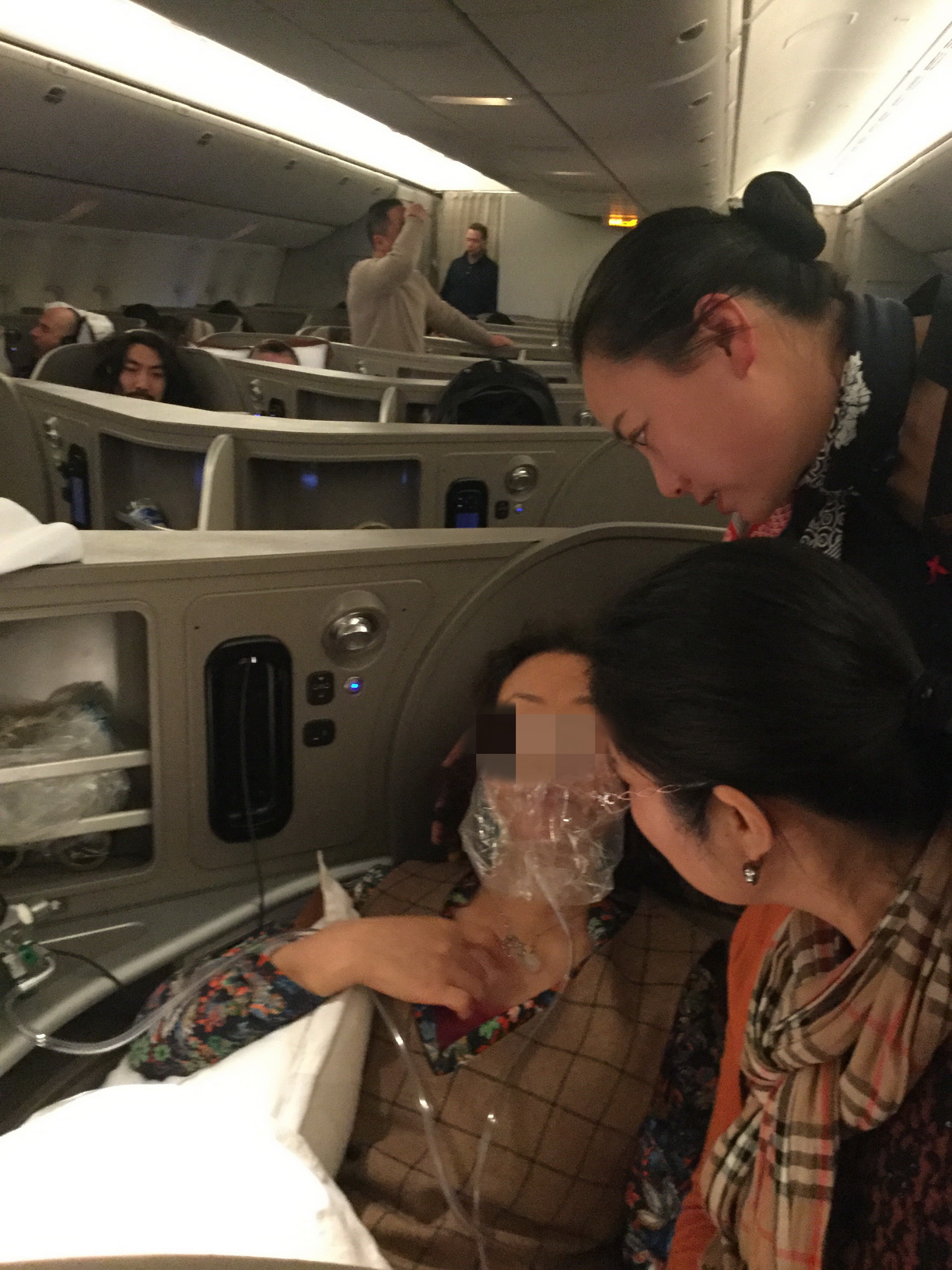 飛(fei)行途中,這名(ming)旅客突然感到(dao)身體不適(shi),出(chu)現呼吸困難(nan),一(yi)度抽搐昏迷(mi),情況十(shi)分危急。東航機組第一(yi)時間實施了(le)緊(jin)急救治(zhi),并將她從經濟艙轉移(yi)到(dao)公務艙平躺休息(xi),還通過機上廣播尋找到(dao)一(yi)名(ming)醫生共(gong)同參與救治(zhi)。