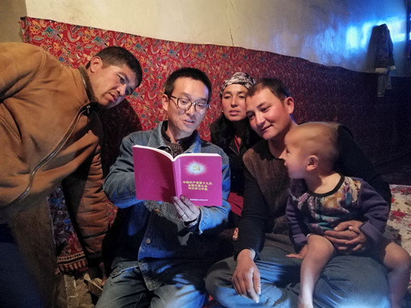 駐村(cun)工作隊(dui)隊(dui)員(yuan)向結(jie)親戶宣傳黨的十九大(da)精(jing)神。