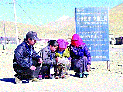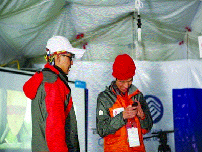 中國移動營業員在(zai)珠峰(feng)大本營為客戶(hu)調試手機