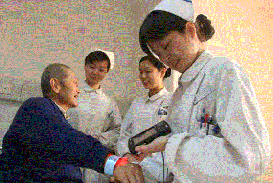 借助中國移動提供的(de)信息產(chan)品,醫護人員正通(tong)過患者佩戴的(de)“電(dian)子腕帶”采集健康信息