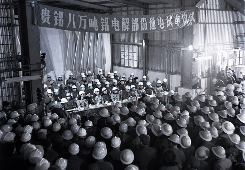 圖為1981年12月18日(ri),從(cong)國外(wai)成套引進的貴鋁(lv)8萬噸鋁(lv)電(dian)解生產線(xian)部分通電(dian)試車
