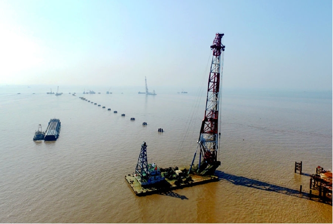 近日,寧波(bo)舟山港主(zhu)通道舟岱跨海大(da)橋2標首根108米鋼管樁,由海虹(hong)6號打樁船打設完畢,沉樁精度符合設計及(ji)規范要求。