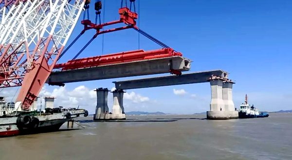 近日(ri),隨著“奮進(jin)號(hao)”起(qi)重船起(qi)吊提梁,寧波舟山港主通(tong)道舟岱跨海大(da)橋非通(tong)航孔70米箱梁第100片架設完成。