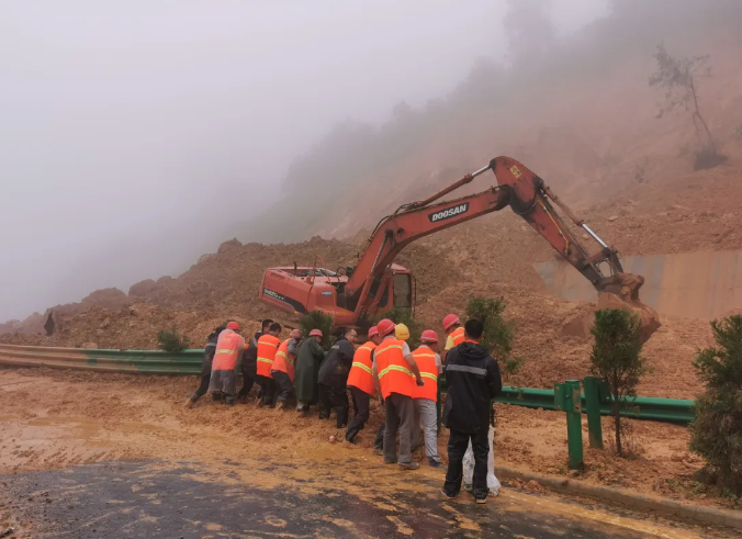 現場人員介紹(shao),滑坡約3000方(fang),共投入(ru)4臺(tai)挖掘機、7臺(tai)裝載(zai)車、1臺(tai)鏟車、1臺(tai)灑水車和(he)60余(yu)人次,加(jia)班加(jia)點冒雨(yu)持續(xu)奮(fen)戰20多個小(xiao)時(shi),于18日(ri)8時(shi)許,搶通(tong)鶴宣方(fang)向(xiang)車道并恢復單向(xiang)通(tong)行(xing),于11時(shi)50分,完成(cheng)宣鶴方(fang)向(xiang)全(quan)部(bu)車道的(de)泥土落石轉(zhuan)運、路(lu)面(mian)清掃(sao)沖洗、交安設施擺放等工作,道路(lu)恢復雙(shuang)向(xiang)通(tong)行(xing)。