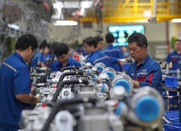 一季度,玉柴發動機訂單供不應求,生產線上的工人正在忙碌地組裝發動機