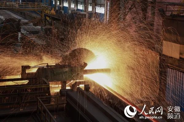 鋼材切割時,四濺的火星猶如一幅畫。圖為馬鋼H型鋼生產線。(人民網 王曉飛攝)