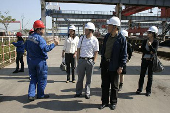 參觀學習中,國資委團委成員與北船重工團委成員就如何開展好新形勢下的共青團建設工作等熱點問題進行了廣泛的交流;團員青年們參觀了海西灣造修船基地,仔細了解船舶制造工藝流程,并參觀了中國目前最大的50萬噸船塢。