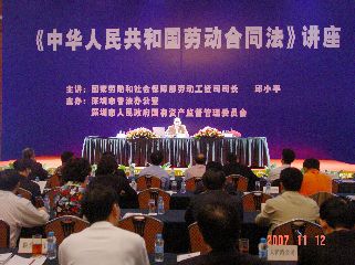 11月12日上午,深圳市國資委、市普法辦在五洲賓館聯合舉辦了《勞動合同法》理解與適用講座,國家勞動和社會保障部勞動工資司司長、《勞動合同法》立法小組成員邱小平就《勞動合同法》的立法背景、立法原則、主要特點及貫徹實施等方面的內容進行了詳細的講解。