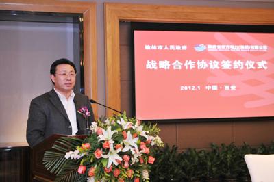 陜西省地電集團董事長、總經理戚曉耀同榆林市委書記胡志強出席并講話,陜西省地電集團黨委書記、副董事長王鵬和榆林市市長陸治原代表雙方在協議書上簽字。雙方一致同意加大對榆林電網的建設力度,以促進榆林能源化工基地的發展。