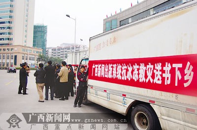 2月4日,廣西自治區新聞出版局組織區內出版發行單位向災區送書,當天共向各災區送出了3.17萬冊圖書,捐款21萬元,機關干部職工捐款8200元,另還趕印了一批年畫和春聯送到災區。