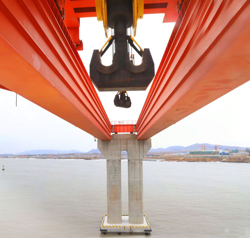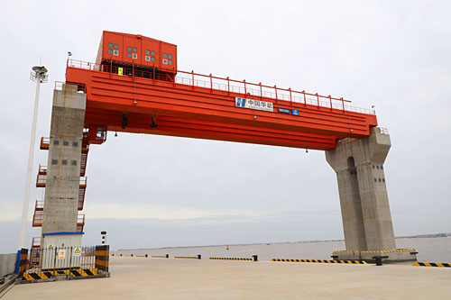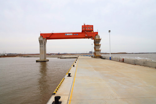 太重設(she)計制造(zao)的(de)跨度最大(da)的(de)固定橋式起重機如巨人般(ban)聳立在華能山東石島灣高溫氣冷堆(dui)核電廠碼頭(tou),為(wei)其大(da)件設(she)備(bei)運輸提供碼頭(tou)裝卸船(chuan)作(zuo)業。
