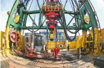 我國超級鉆機“地殼一號”創亞洲國家大陸科學鉆井新紀錄。圖為工作人員在鉆井平臺檢查井口。(新華社發)