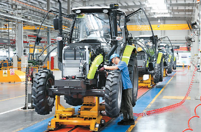 位于安徽蕪湖三山經濟開發區的中聯重科重機公司,中國工人在組裝自主研發的拖拉機。這些拖拉機將出口東南亞、非洲、南美等海外市場。(人民視覺 程依寶攝)