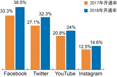 《報告》對(dui)中(zhong)(zhong)(zhong)央(yang)(yang)企(qi)(qi)(qi)業海(hai)外(wai)社(she)(she)交媒體(ti)布局情(qing)況進行了統計,截至2018年底,96家中(zhong)(zhong)(zhong)央(yang)(yang)企(qi)(qi)(qi)業海(hai)外(wai)社(she)(she)交媒體(ti)平(ping)臺(Facebook、Twitter、YouTube、Instagram)的整體(ti)開通(tong)(tong)率為47.9%,共46家中(zhong)(zhong)(zhong)央(yang)(yang)企(qi)(qi)(qi)業開通(tong)(tong)278個賬(zhang)號。與2017年的42家中(zhong)(zhong)(zhong)央(yang)(yang)企(qi)(qi)(qi)業相比(bi),2018年社(she)(she)交媒體(ti)平(ping)臺的開通(tong)(tong)率增(zeng)長4.1%,新增(zeng)4家企(qi)(qi)(qi)業。其中(zhong)(zhong)(zhong),2018年中(zhong)(zhong)(zhong)央(yang)(yang)企(qi)(qi)(qi)業在Facebook的開通(tong)(tong)率居四大(da)境外(wai)社(she)(she)交平(ping)臺首位,高達38.5%,共37家中(zhong)(zhong)(zhong)央(yang)(yang)企(qi)(qi)(qi)業開通(tong)(tong)118個賬(zhang)號。(見圖2、3)
