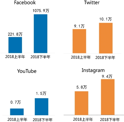 2018年以(yi)來(lai),尤其是6月份(fen)以(yi)后,央(yang)企(qi)(qi)及其子公司新(xin)開通了(le)幾十個境(jing)外社交媒體賬號(hao)(hao)。受此影響,與2018年上(shang)半年相比(bi),Facebook平(ping)(ping)臺(tai)中央(yang)企(qi)(qi)業集(ji)團(tuan)(tuan)賬號(hao)(hao)的(de)總粉(fen)絲(si)(si)量(liang)增(zeng)長(chang)最迅猛,增(zeng)長(chang)率高達385.2%,增(zeng)長(chang)量(liang)為(wei)850余萬。其次,YouTube平(ping)(ping)臺(tai)央(yang)企(qi)(qi)集(ji)團(tuan)(tuan)賬號(hao)(hao)的(de)總粉(fen)絲(si)(si)量(liang)增(zeng)長(chang)率也(ye)非常可(ke)觀,為(wei)101.2%,增(zeng)長(chang)量(liang)為(wei)7523個;與上(shang)半年相比(bi),Instagram平(ping)(ping)臺(tai)央(yang)企(qi)(qi)集(ji)團(tuan)(tuan)賬號(hao)(hao)的(de)粉(fen)絲(si)(si)量(liang)增(zeng)長(chang)62.0%,增(zeng)長(chang)了(le)3.6余萬;Twitter平(ping)(ping)臺(tai)央(yang)企(qi)(qi)集(ji)團(tuan)(tuan)賬號(hao)(hao)總粉(fen)絲(si)(si)量(liang)增(zeng)長(chang)率為(wei)10.7%,粉(fen)絲(si)(si)量(liang)比(bi)上(shang)半年增(zeng)長(chang)近萬個。(見圖4)
