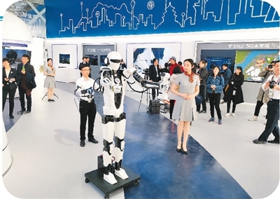 北京世園會中國電信5G體驗館內,工作人員正在演示接入5G信號的5G·AI人工智能機器人。借助5G技術低時延的特點,這款機器人可以對人的肢體運動作出快速反應。(張鵬禹攝)