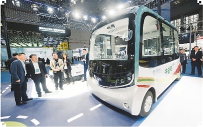 4月16日的上海車展上,參觀者在觀看運用5G技術的無人駕駛小巴。(龍巍攝)
